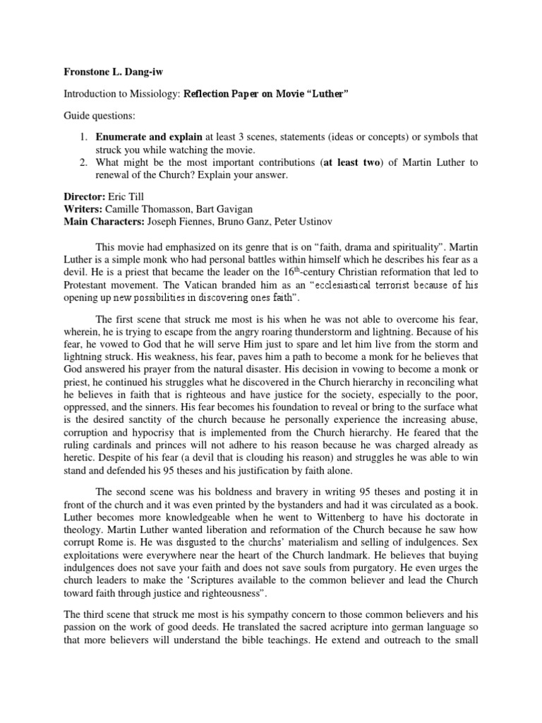 The plot is unknown at this time. King sought equality and human rights for african americans, the economically disadvantaged and all victims of injustice. It was directed by irving pichel, (who also plays a supporting role), and stars niall macginnis as luther. Works of martin luther, with introductions and notes, volume 1/disputation on indulgences. He survives and becomes a monk. He promises to become a monk if god lets him live get an answer for 'provide a summary of the movie luther (eric till, 2003) starring joseph fiennes.' and find homework help for other religion questions. Martin luther was born on 10 november 1483, in eisleben, germany. Joseph fiennes stars as martin luther, whose bold actions fostered an era of personal and religious freedoms we have to take the script's word that martin luther was such an influential man because nothing in fiennes' performance remotely suggests it.… Martin luther was a german monk who forever changed christianity when he nailed his '95 theses' to a church door in 1517, sparking the protestant comedian martin lawrence got hist start hosting hbo's 'def comedy jam' before appearing in movies like 'bad boys' and 'big momma's house.' It begins with luther's early life where he graduated from erfurt college. Martin luther is a 1953 black and white biopic of martin luther, leader of the protestant reformation. Pentru a scrie un review trebuie sa fii autentificat. Luther movie reviews & metacritic score: